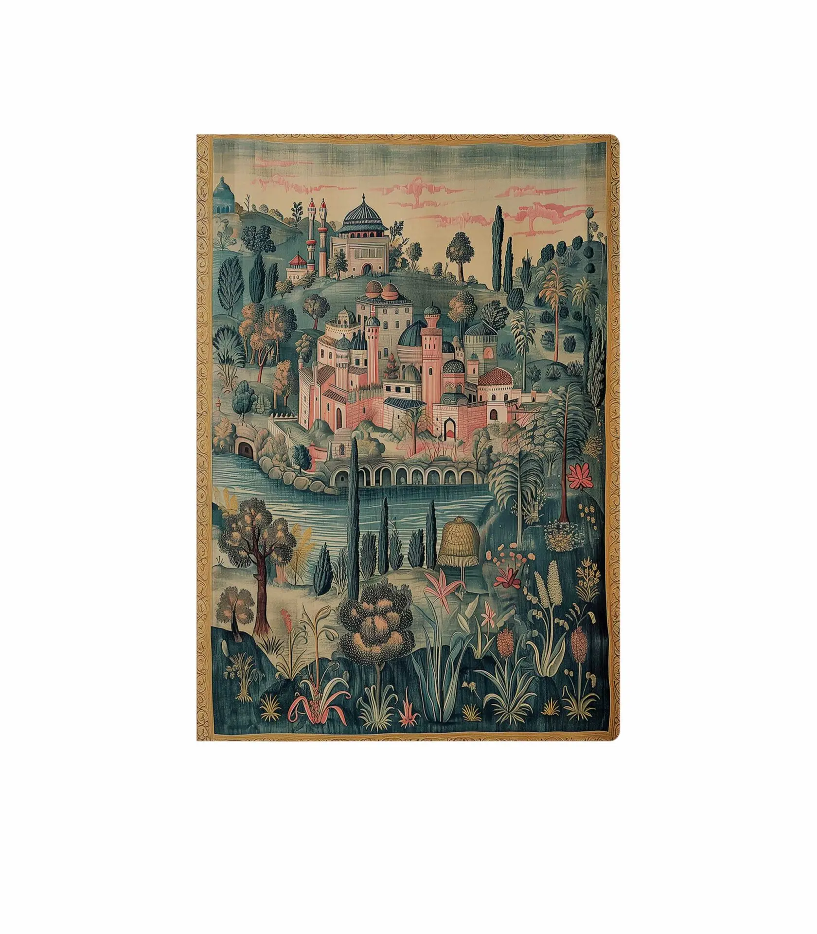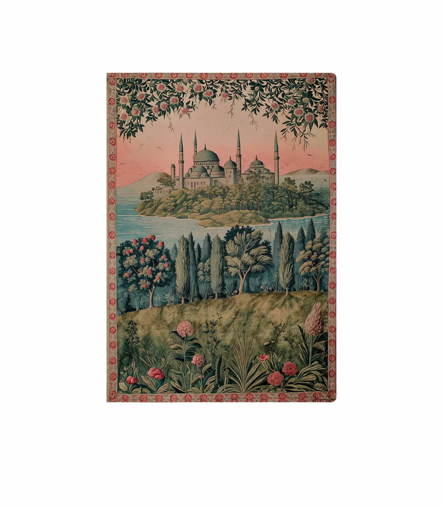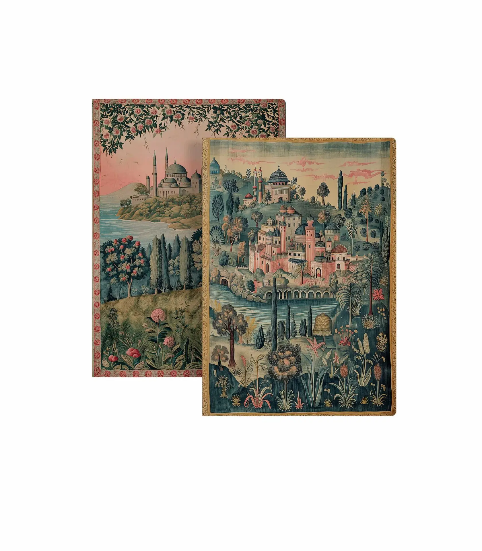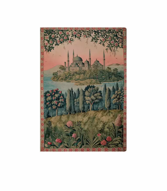 İki ayrı manzara, aynı sessiz huzurun iki farklı yüzü gibi duruyor. Biri pembe bir akşamın yumuşak ışığında, kıyıya doğru uzanan bir camiyi sakince gösteriyor; etrafında çiçekler, uzakta suyun dinginliği… Diğeri daha geniş bir hayal âlemi: tepelerin arasına serpilmiş kubbeler, köprüler, kıvrılan yollar ve masalsı bitkiler.