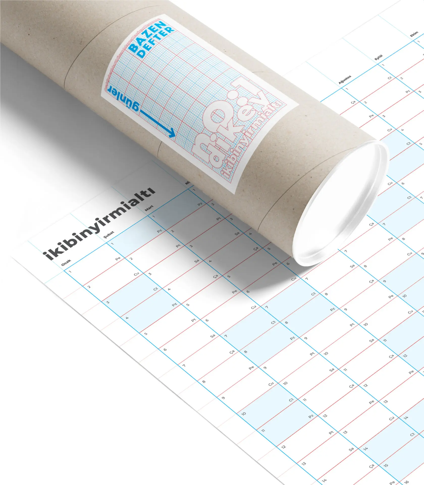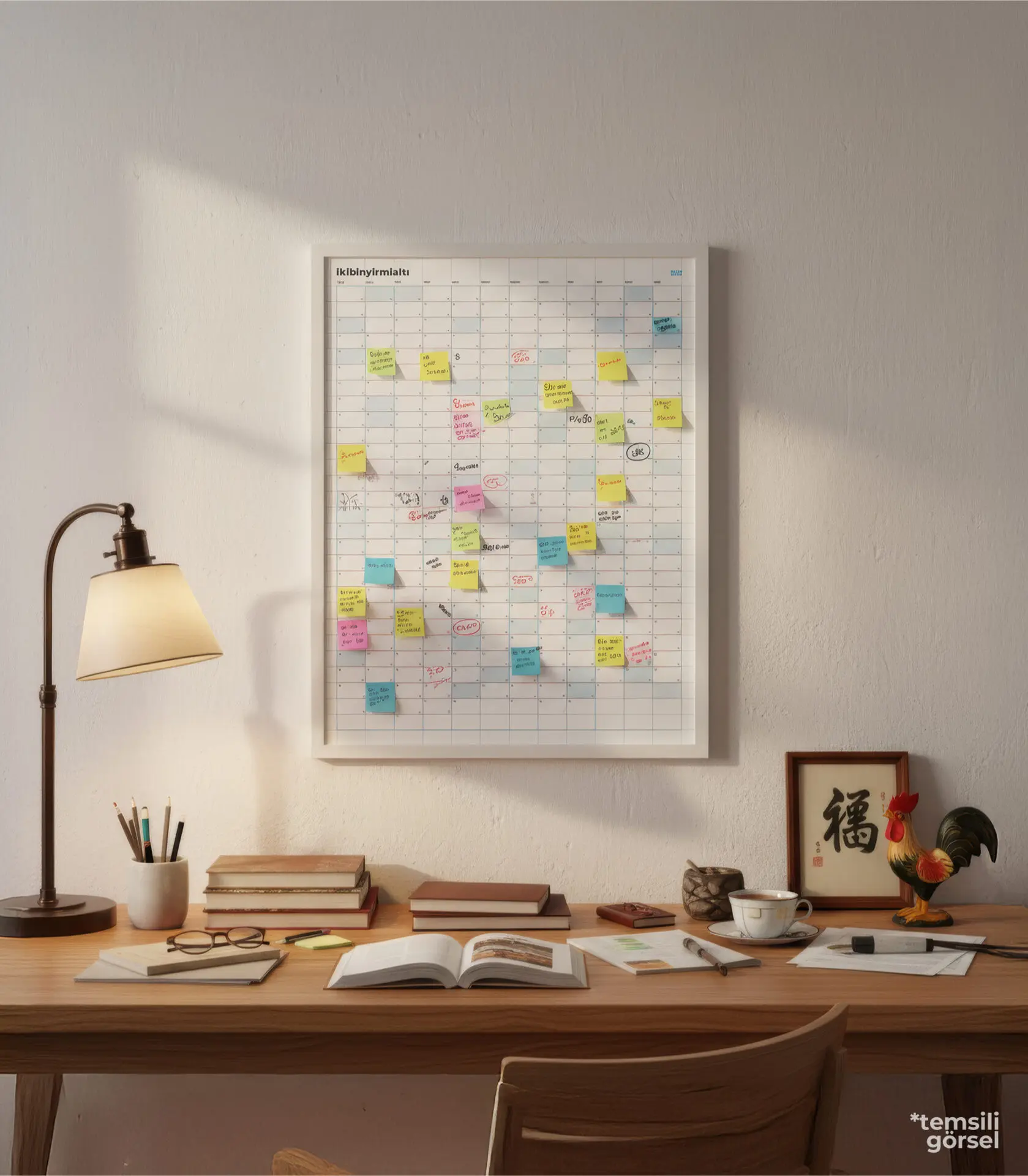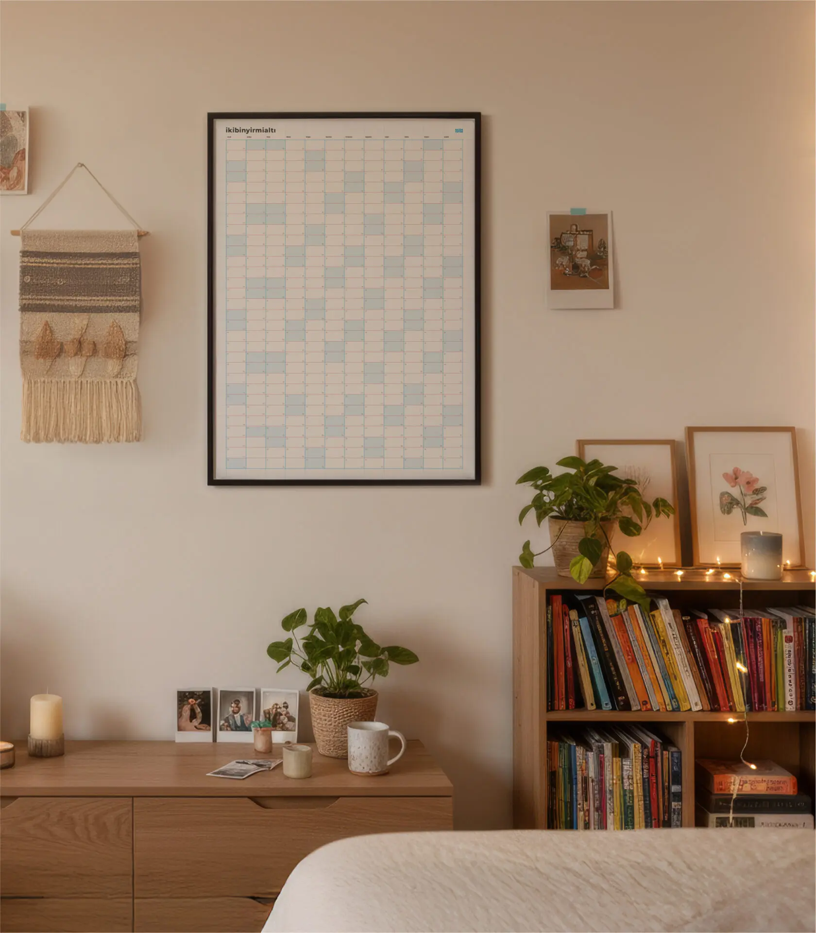 Bazen Defter Yıllık Planlayıcı; yılın tüm günlerini tek bir poster üzerinde görmeni sağlar. Alışkanlık takibi yapmak, önemli günleri işaretlemek ve yılı birlikte planlamak için sade bir alan sunar.