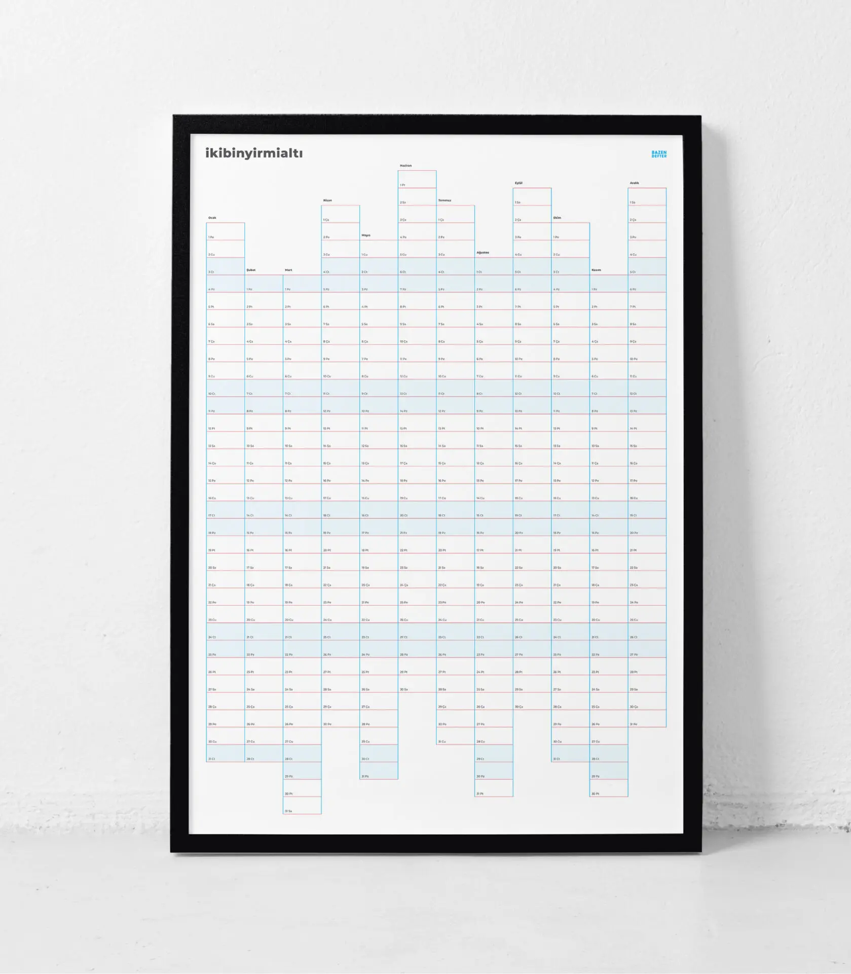 Bazen Defter Yıllık Planlayıcı; yılın tüm günlerini tek bir poster üzerinde görmeni sağlar. Alışkanlık takibi yapmak, önemli günleri işaretlemek ve yılı birlikte planlamak için sade bir alan sunar.