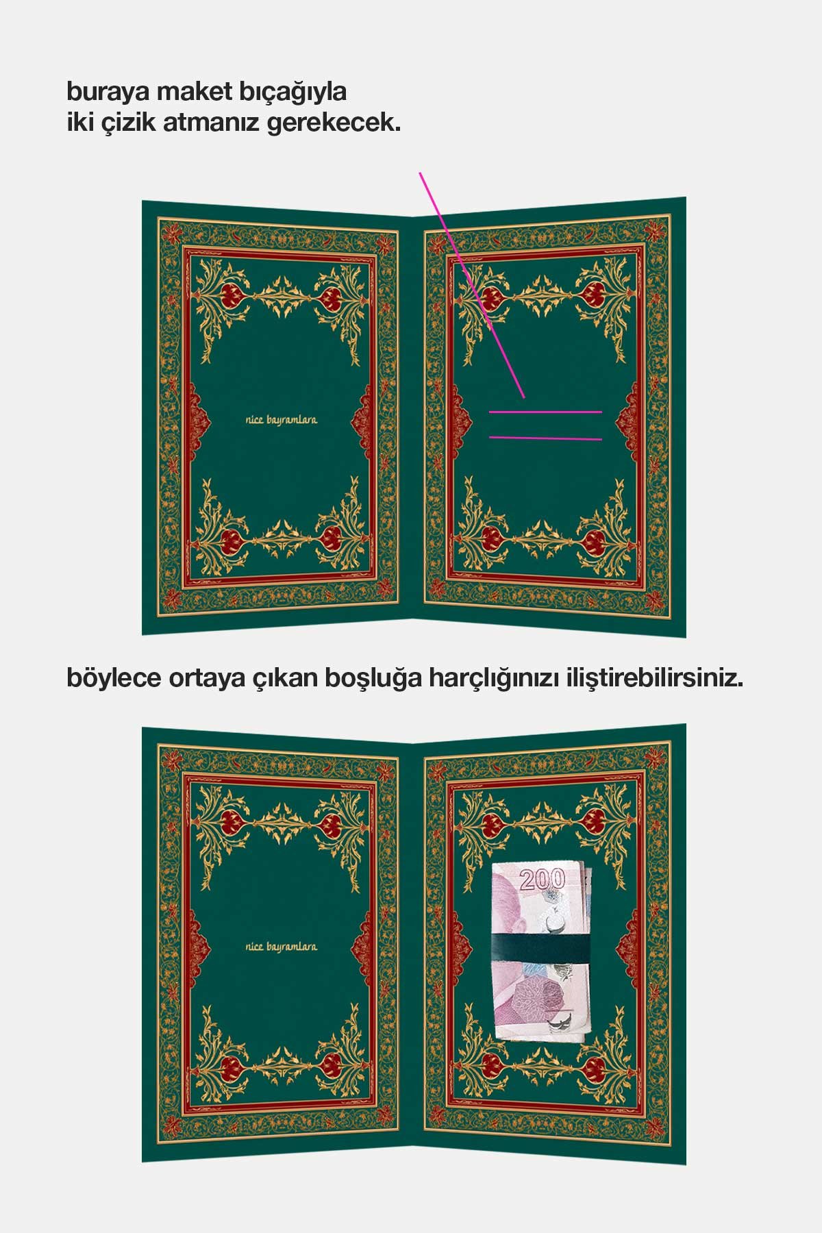 350 gram mat kuşe kağıda baskı. Para iliştirilecek yeri sizin kesmeniz gerekir.