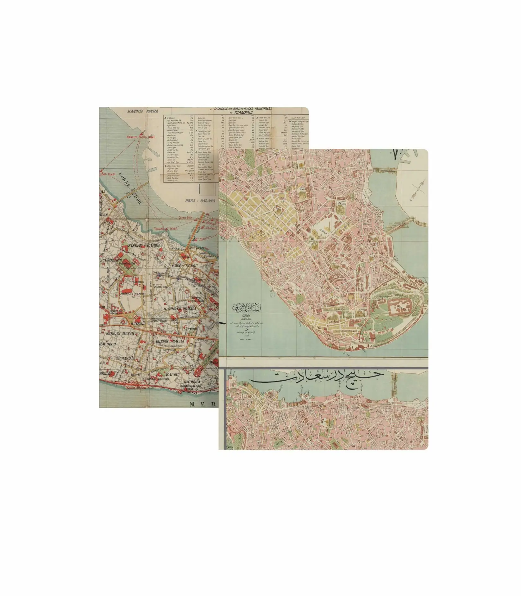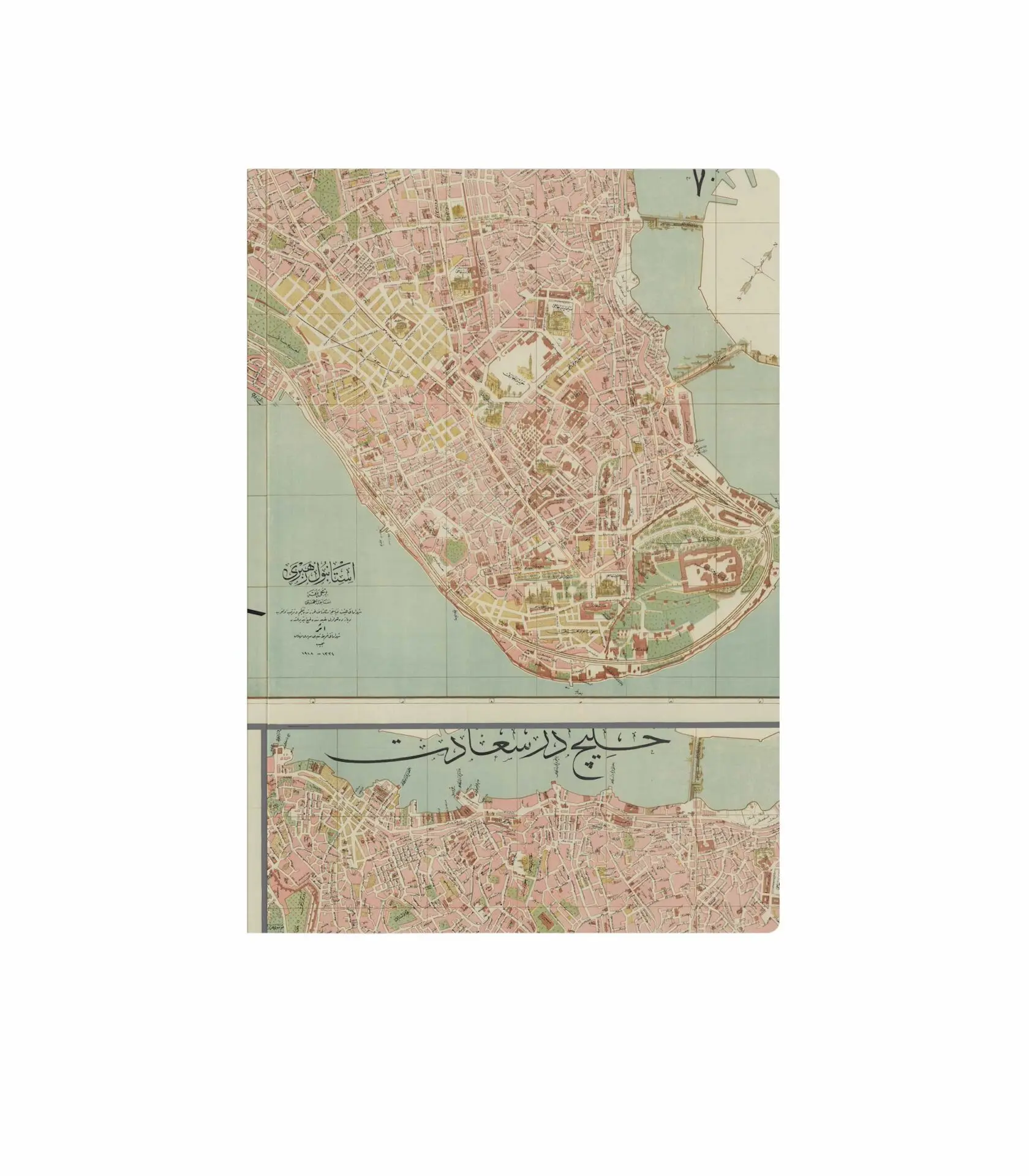 Bir zamanlar yollar bu kadar karmaşık değildi — belki de biz yolu daha iyi biliyorduk. Bu defterlerin kapağında, eski bir İstanbul haritası uzanıyor: semtler tanıdık, yazılar Osmanlıca, renkler pastel bir sessizlikte. Galata, Üsküdar, Sultanahmet… Hepsi orada, kâğıdın üstünde hâlâ birbirine bakıyor.