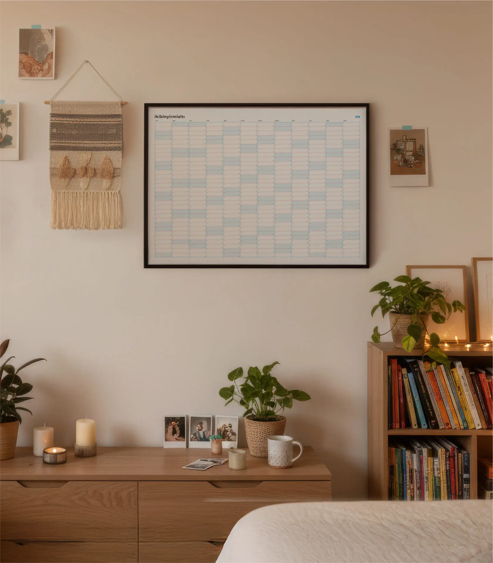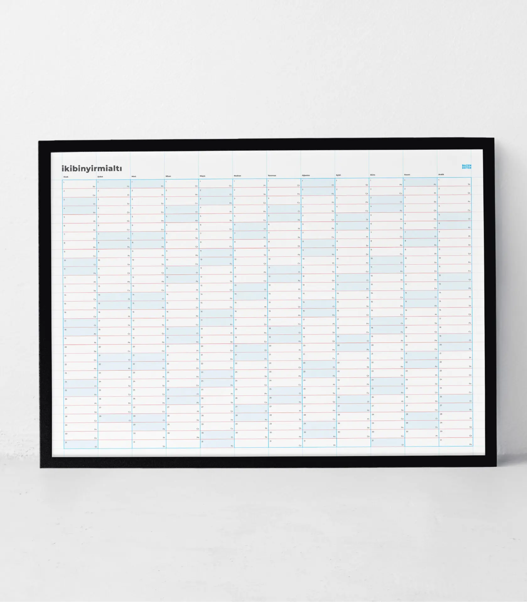Bazen Defter Yıllık Planlayıcı; yılın tüm günlerini tek bir poster üzerinde görmeni sağlar. Alışkanlık takibi yapmak, önemli günleri işaretlemek ve yılı birlikte planlamak için sade bir alan sunar.