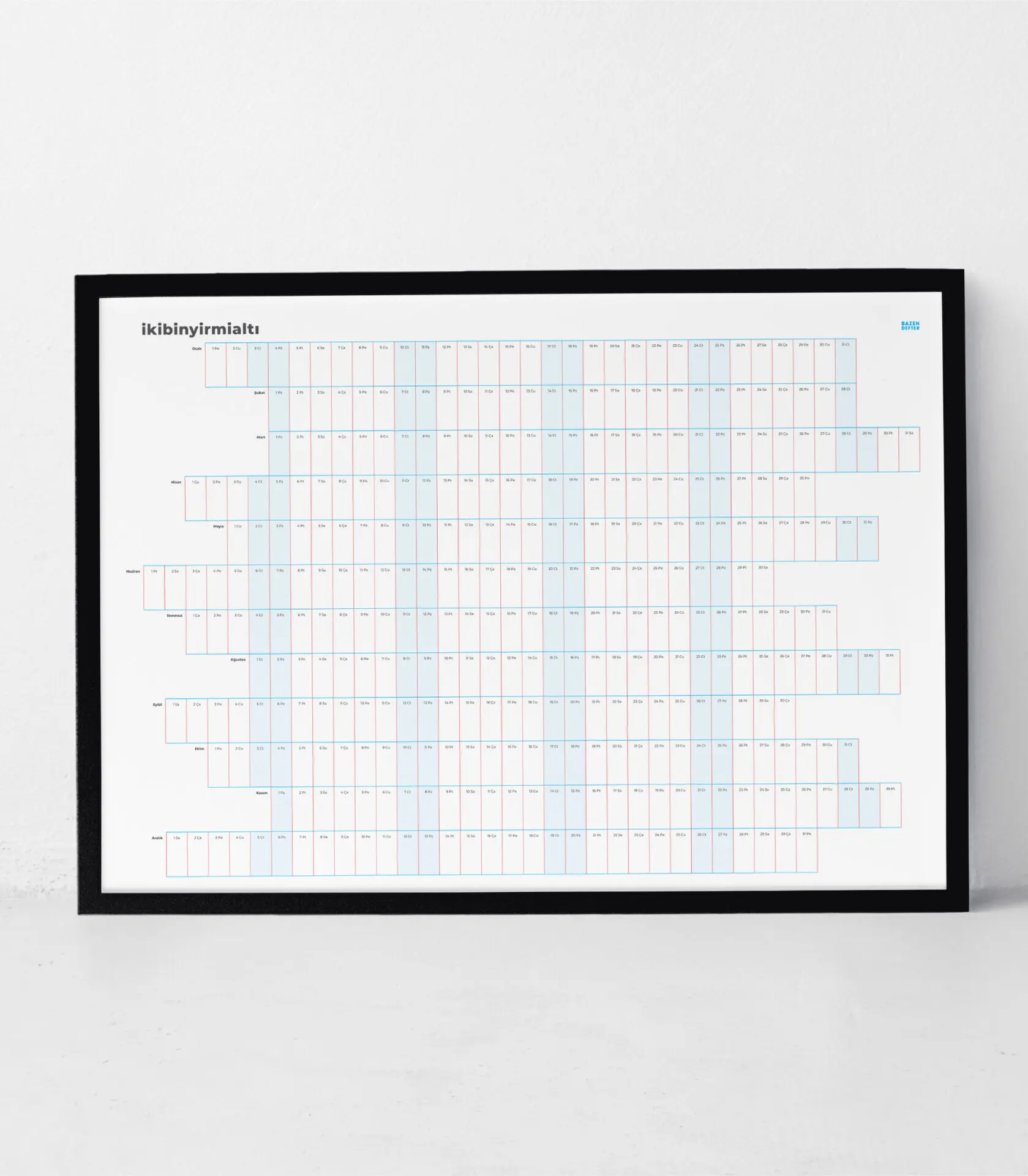 Bazen Defter Yıllık Planlayıcı; yılın tüm günlerini tek bir poster üzerinde görmeni sağlar. Alışkanlık takibi yapmak, önemli günleri işaretlemek ve yılı birlikte planlamak için sade bir alan sunar.
